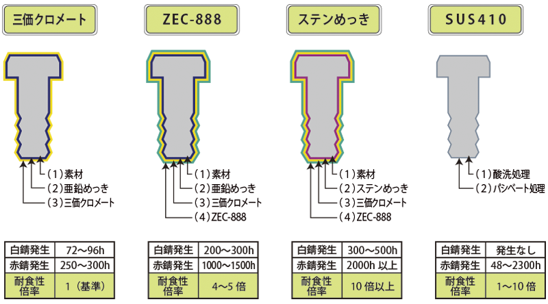ステンめっきはステンレス組成に更に耐食性をあげるための工夫をしているので、通常のめっき厚でも実際の耐食性能はステンレス同等以上です。アルミ部材への電食対策として広く利用されているステンレスよりもステンめっきは、電食性能に優れています。各種塗装の後処理問題(座ぐり再処理)の発生もありません。 |